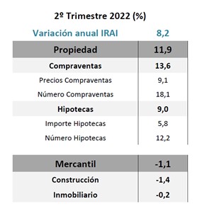 Con relación a los componentes de la evolución del IRAI mostrada en los datos anuales al término del segundo trimestre, el crecimiento se produjo fundamentalmente por el incremento en el área de propiedad (11,9%), nuevamente debido al gran aumento del número de compraventas (18,1%) y del incremento del número de hipotecas (12,2%), acompañados del precio de las compraventas (9,1%) y también del importe de las hipotecas (5,8%).