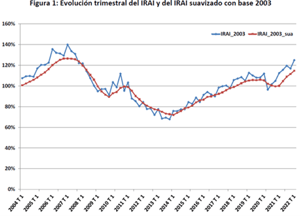 El valor del índice se situó en 124,8 (116,8 el trimestre anterior) y el índice suavizado, libre de factores estacionales, en 114,6 (111,5 el trimestre anterior). Desde el 2º trimestre de 2020, que marcó 96,4, se viene produciendo una recuperación de la actividad inmobiliaria, a excepción del ligero descenso del 4ª trimestre de 2021. Esta evolución favorable se debe, sobre todo, a la tendencia positiva de la parte de propiedad (8,7% trimestral), mientras que en la parte mercantil del IRAI, esencialmente más constante en los últimos trimestres, el crecimiento ha sido más moderado (1,7% trimestral).