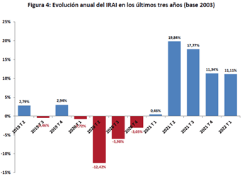 La evolución anual del IRAI durante el primer trimestre obtiene una subida del 11,1% frente al mismo trimestre de 2021, similar al último trimestre de 2021, aunque inferior a los grandes incrementos anuales registrados durante el segundo y tercer trimestres del año pasado, afectados todavía en la comparación con los mismos períodos de 2020, debido al gran impacto de la crisis sanitaria sobre la economía, que provocó en aquel momento caídas del 12,4% en el segundo y del 6,0% en el tecero. Continúa, por tanto, de forma más moderada pero robusta, el crecimiento de la actividad iniciado en el segundo trimestre de 2021. Como se aprecia en el siguiente gráfico, la evolución anual ha compensado ya claramente los descensos de 2020, y el crecimiento de los cuatro últimos trimestres, aunque matizado por la comparación con los peores momentos de la pandemia en 2020, sigue consolidando crecimientos muy importantes de la actividad inmobiliaria global.