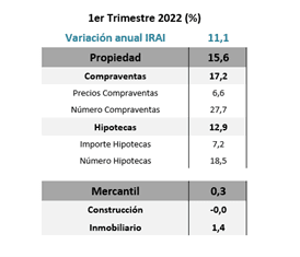 Con relación a los componentes de la evolución del IRAI mostrada en los datos anuales al término del primer trimestre, el crecimiento se produjo fundamentalmente por el incremento en el área de propiedad (15,6%), nuevamente debido al gran aumento del número de compraventas (27,7%) y del incremento del número de hipotecas (18,5%), acompañados del precio de las compraventas (6,6%) y también del importe de las hipotecas (7,2%).