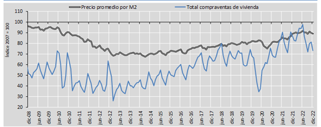 En diciembre, la compraventa de viviendas decreció un 17,8% interanual, con precios promedio prácticamente estables (0,5%). La concesión de nuevos préstamos hipotecarios para la adquisición de vivienda retrocedió un 22,5%.