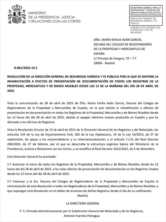 REGISTROS. Resolución de la Dirección General de seguridad jurídica y fe pública por la que se dispone la inhabilitación a efectos de presentación de documentación en todos los registros de la propiedad, mercantiles y de bienes muebles desde las 12 de la mañana del día 28 de abril de 2025.