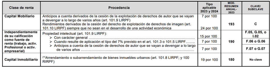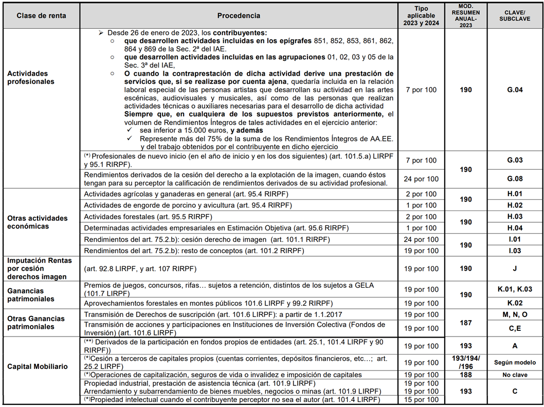 Cuadro informativo tipos de retención aplicables
