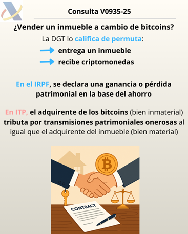 IRPF/ITP. VENTA INMUEBLE. La venta de un inmueble a cambio de criptomonedas tributan como permuta en el IRPF