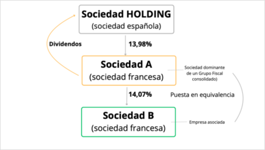 Una sociedad holding española puede aplicar la exención del artículo 21 de la LIS sobre dividendos de una participada francesa, sin necesidad de examinar la participación indirecta, al no superar el límite de ingresos financieros en la cuenta consolidada