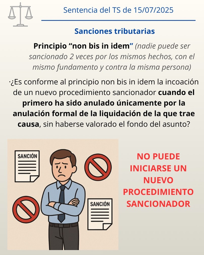 - «En los supuestos en los que se anuló un primer acuerdo sancionador como consecuencia exclusiva de la anulación, por motivos formales, de la liquidación de la que traía causa la sanción, la dimensión procedimental del principio non bis in idem se opone al inicio de un nuevo procedimiento sancionador y a una nueva sanción con relación al mismo obligado tributario y por los mismos hechos.»