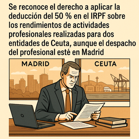 IRPF. DEDUCCIÓN POR RENDIMIENTOS OBTENIDOS EN CEUTA. La Audiencia Nacional avala la deducción del 50% en el IRPF por servicios profesionales efectivamente desarrollados en Ceuta, pese a contar el contribuyente con despacho en Madrid