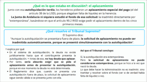 - Los herederos interpusieron recurso de casación (n.º 5673/2023), planteando si el límite de cinco meses del artículo 90.2 RISD contradice el plazo legal del artículo 38 LISD —que permite solicitar el aplazamiento “antes de expirar el plazo reglamentario de pago”—, y si puede exigirse al contribuyente pedir el aplazamiento antes de presentar la propia autoliquidación.