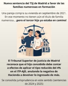 ITP. NASCITURUS (hijo no nacido). El TSJ de Madrid reconoce el derecho de una familia a aplicar el tipo reducido del 4% en ITP-AJD pese a no ostentar aún formalmente el título de familia numerosa en el momento del devengo